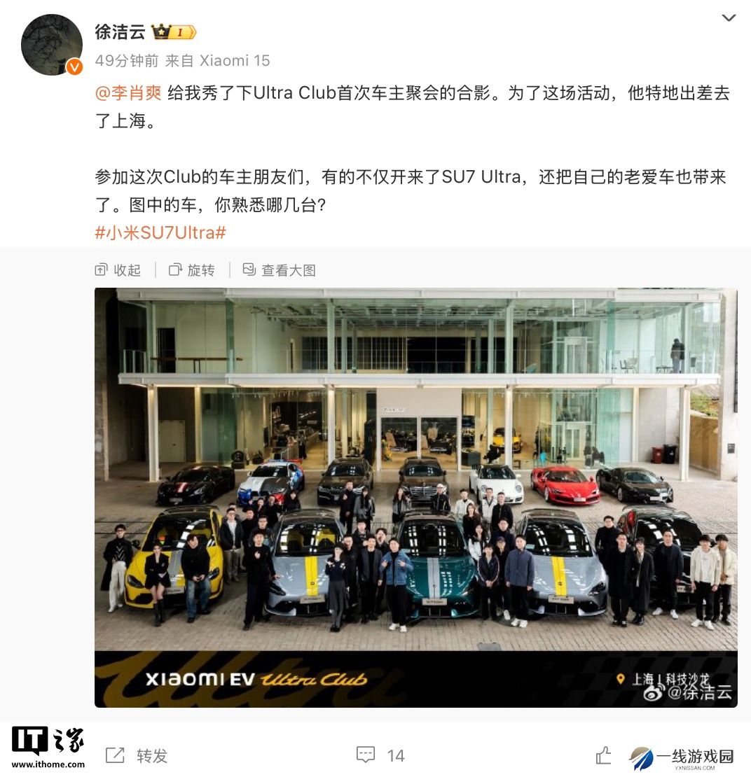 本站 3 月 29 日消息,小米集团董事长特别助理、战略市场部副总经理徐洁云在微博发文,展示了SU7 Ultra汽车 Xiaomi EV Ultra Club会员俱乐部首次车主聚会的合影。参考相应合影,其中店门外共计有12辆车,包括车主的 SU7 Ultra 和他们的“老爱车”。